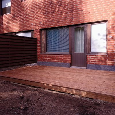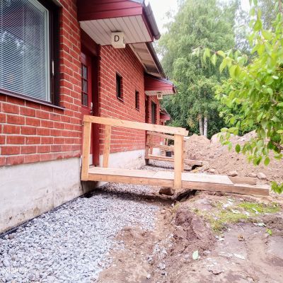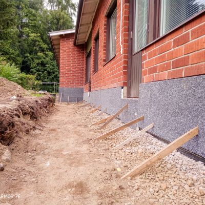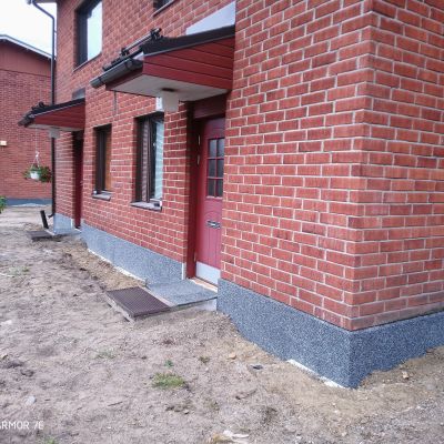 Tässä taloyhtiössä oli huomattu ikävä aikakautensa ongelma, eli puutteellinen sokkelin kuivatus. Tätä varten kohteella laitettiin kerralla koko sokkelirakenne kuntoon. Kuivatimme ison taloyhtiön sokkelin vierustat asentamalla kokonaan uudet salaojat sekä sadevesijärjestelmät. Sokkelin viereen tuli uusi nykyaikainen routaeristys. Sokkeliin lisättiin vielä pinnoitettu kaunis Amperla Thermo lisälämmöneriste, jolla saatiin sokkeliin erittäin tyylikäs ulkonäkö ja parannettu energiateho. Nyt sokkelin kautta ei karkaa enää lämpöä paukkupakkasilla. Kohteen luonteen huomioiden oli samassa urakassa vielä edessä maanpintojen muotoilu sekä viheralueiden uusiminen. Tämän lisäksi piha-alueen murskealueet höylättiin jiiriin ja pintaan levitettiin siisti kalliomurskepintaus. Pisteenä i:n päälle Mavira asensi n.80 m2 uutta terassia ja taloyhtiöön kaikki uudet puiset väliaidat kahden maalikerroksen suojaamana. Kyllä kelpaa taloyhtiön jatkaa kuivin sokkelein ja siistin pihan kanssa eteenpäin.